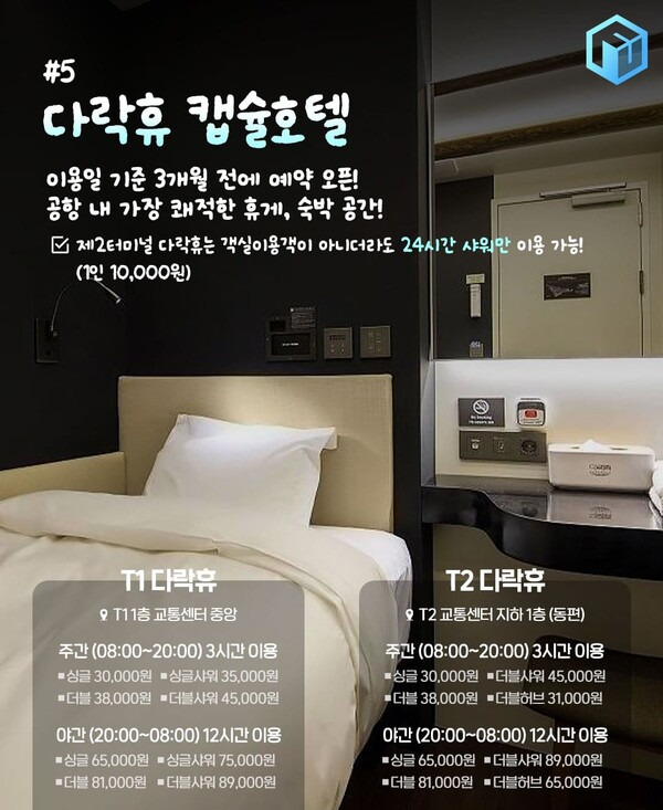 특히 제2터미널 다락휴애서는 객실 예약을 하지 않았더라도 24시간 샤워 시설만 이용이 가능합니다. 1인당 1만원의 요금으로 이용할 수 있으며 수건과 샤워 용품 등이 제공됩니다.