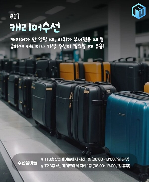 수하물을 맡기기 전이나 수하물을 찾은 뒤, 바퀴나 지퍼 등 캐리어 기능이 고장났을 때 활용할 수 있는 인천공항 꿀팁입니다. 매일 오전 8시부터 오후 8시까지 1터미널과 2터미널에 캐리어수선이 가능한 '수선쟁이들'이 운영중이기 때문입니다.