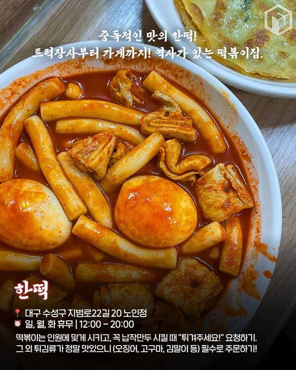 대구 떡볶이의 역사를 이야기할 때 한떡을 빼놓을 수 없는데요. 떡볶이 트럭 장사에서 시작해 지금까지도 많은 사랑을 받고 있는 전통 있는 떡볶이집으로, 한 번 맛보면 계속 생각나는 마성의 맛을 자랑하는 곳입니다.
