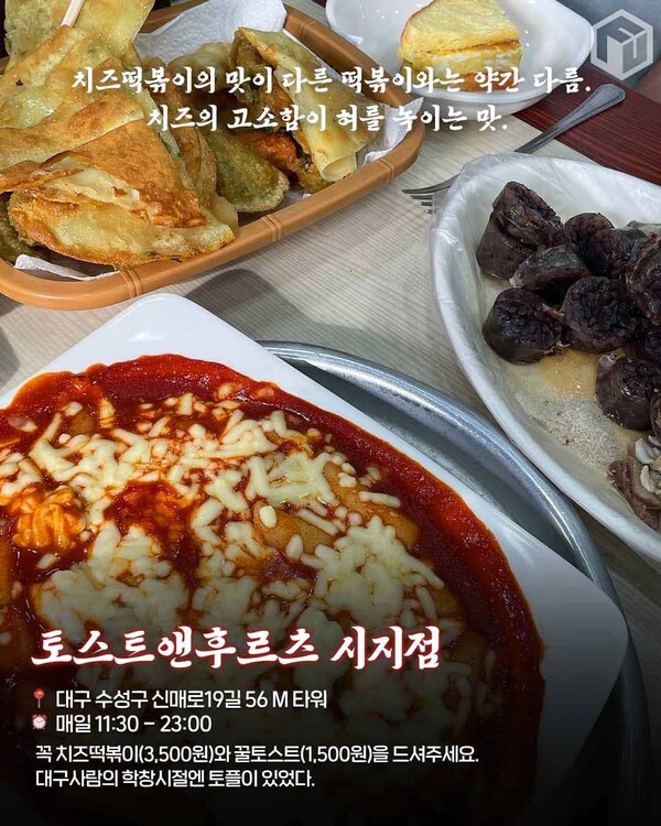 바삭하게 구운 토스트에 달콤한 꿀이 스며들어, 매콤하고 고소한 치즈 떡볶이와 찰떡궁합을 자랑합니다. 한입 먹으면 겉은 바삭, 속은 촉촉한 꿀토스트가 떡볶이 양념과 만나 완벽한 균형을 이루는 대구 떡볶이 성지 입니다.