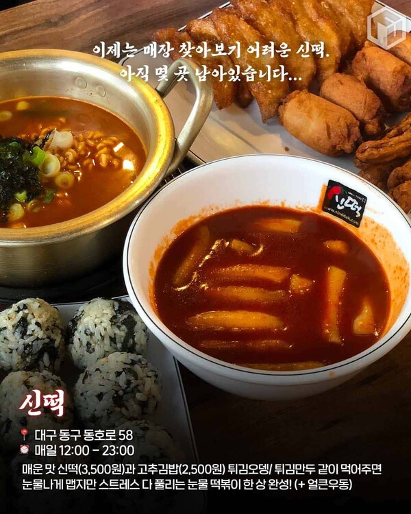매운 떡볶이와 매운 김밥을 함께 먹어주는 것이 신떡을 가장 잘 즐기는 방법입니다. 얼얼한 매운 맛으로 유명한 신떡은 대구의 떡볶이 맛집입니다.
