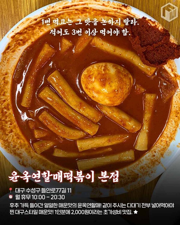 한 입 먹는 순간 입안이 얼얼해지는 중독성 있는 맛으로 대구 현지 매운맛 덕후들 사이에서는 대구 필수 방문 맛집코스로 손꼽힙니다.