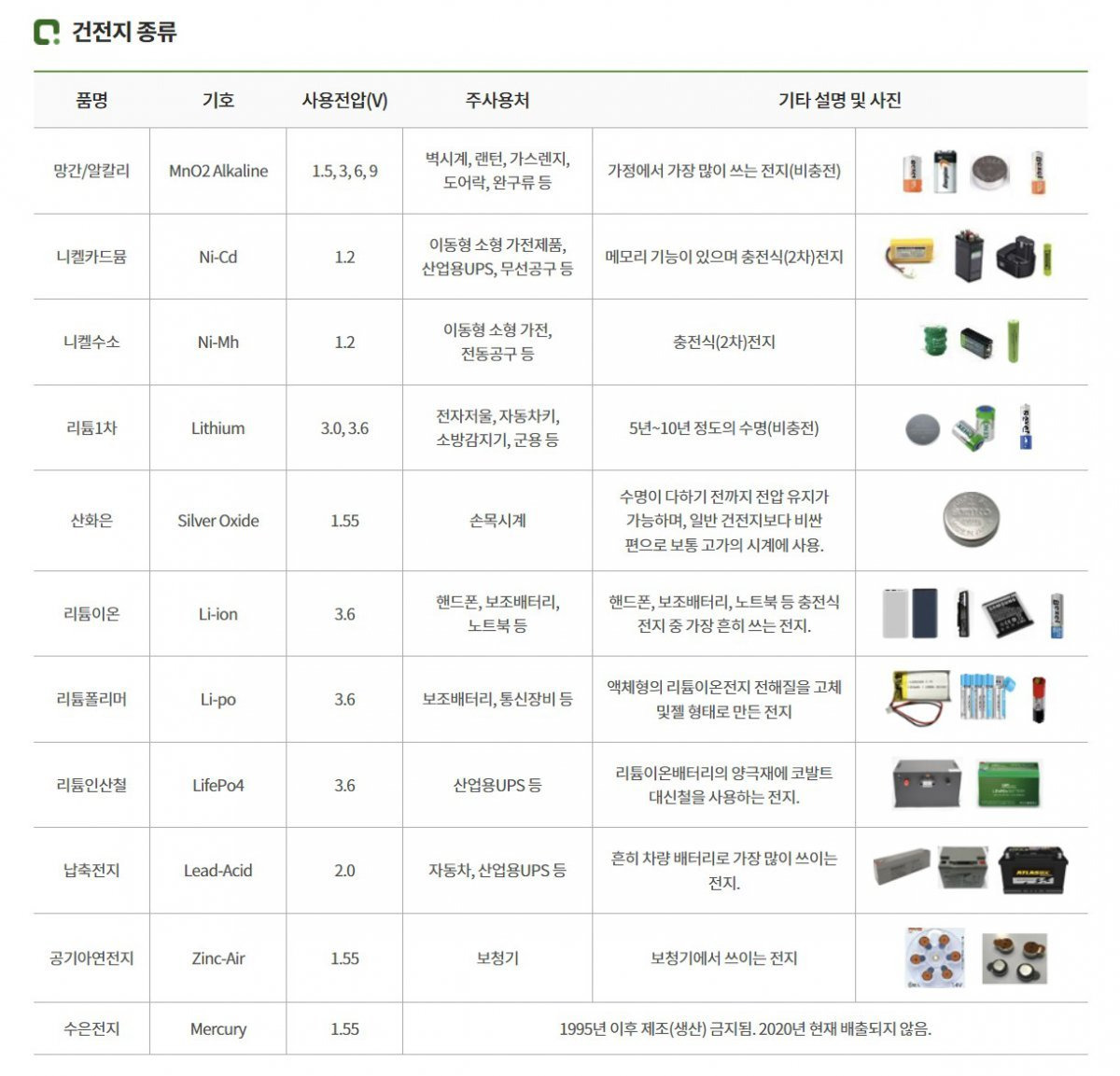 * 1차 전지: 일회용으로 한 번 사용하면 수명이 끝나는 배터리 (예: 알카라인, 단추형).