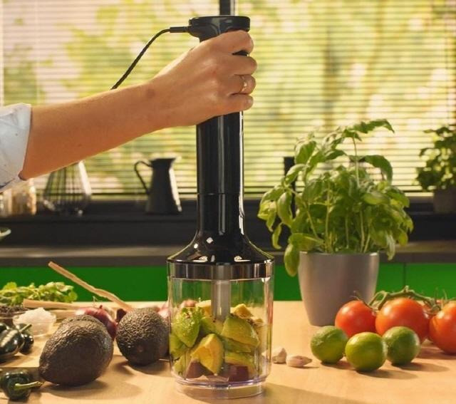필립스의 비바 핸드블렌더 또한 쉽게 사용할 수 있는 핸드블렌더로 많은 추천을 받는다. 손잡이에는 스피 드 조절 버튼이 있어서 강약 조절을 쉽게 할 수 있으 며, 액세서리를 바꾸거나 사용 후 청소할 때도 원터치 버튼으로 제품을 분리할 수 있어 간편하다. 800W의 출력을 가지고 있어 빠르고 강력한 블렌딩이 가능한 핸드블렌더로 평가된다. 10만 원이 조금 안 되는 판 매가에 판매되고 있다.