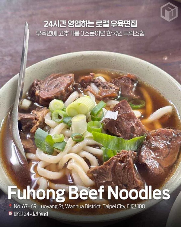 대만을 대표하는 소울푸드, 우육면(牛肉麵)! 수많은 맛집 중에서도 Fuhong Beef Noodles는 깊고 진한 국물과 부드러운 소고기로 현지인들에게 사랑받는 명소인데요. 24시간 운영하는 이곳은 새벽 2시에도 빈자리를 찾기 어려울 정도로 인기가 좋습니다.