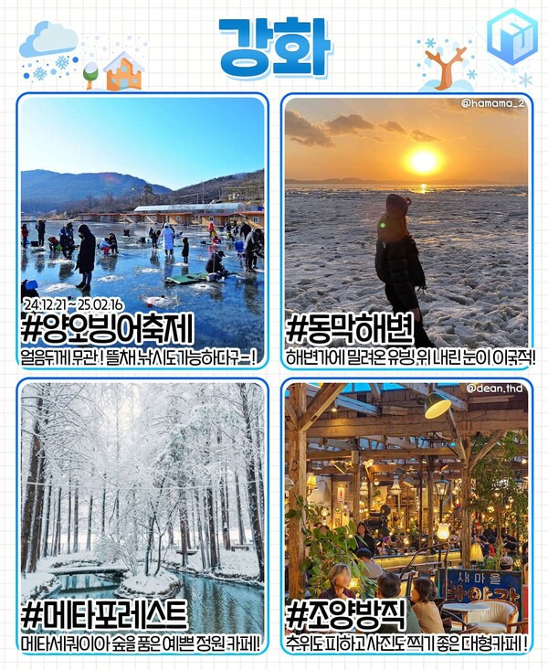 1월 당일치기 여행지로 추천하는 강화도에서는 황홀한 겨울 풍경은 물론 특색있는 겨울 축제가 개최됩니다. 얼어붙은 낚시터에 구멍을 뚫고 즐기는 빙어낚시와 얼음썰매낚시, 뜰채 빙어잡기 등 다양한 낚시 체험을 할 수 있는 양오빙어축제는 12월 21일부터 2월 16일까지 진행되는데요. 날씨에 따라 얼음이 충분히 얼지 않을 때엔 뜰채 체험으로 대체됩니다.