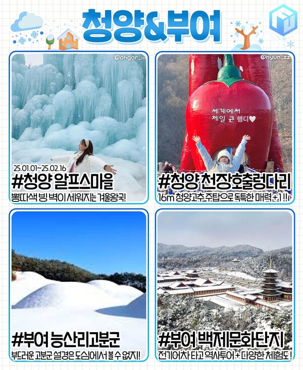 매년 겨울 동화같은 겨울왕국이 펼쳐지는 청양입니다. 인근 부여와 함께 연계해 1박 2일 국내 여행지로 추천하는 여행지인데요. 축제와 설경을 모두 즐길 수 있으나, 당일치기 여행이라면 한 지역만 집중해서 다녀오는 것이 효율적입니다.