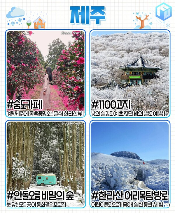 제주도에서 눈부신 설경 속으로 뛰어들 수 있는 한라산 어리목탐방로입니다. 한라산 탐방로 중에서도 비교적 완만한 경사가 이어지는 곳으로 어린 아이들과 함께 가도 무리없이 오를 수 있는데요. 실시간 CCTV로 적설 현황을 확인해 방문한다면 발이 푹푹 빠질만큼 높게 쌓인 눈밭을 마주할 수 있습니다.