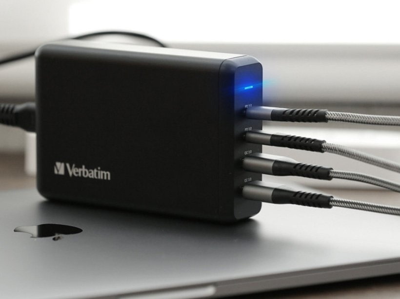 버바팀의 멀티충전기는 최대 156W의 출력을 지원하 는 제품이다. PD 충전을 지원하는 C타입 포트 두 개에 QC3.0의 18W 포트 두 개까지 총 네 개의 포트를 갖추 고있다. 2포트 동시 사용 시 최대 120W의 출력으로, 노트북을 동시에 두 대 충전할 수 있다. PPS 20V 5A를 지원해, PPS 초고속 충전도 완벽하게 지원한다. QC 2.