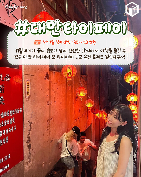 인기 관광지인 타이베이 101, 중정기념당, 용산사 같은 장소에서 관광을 즐길 수 있는데요. 특히 11월은 타이베이의 근교인 베이터우에서 타이베이 핫스프링 페스티벌이 열려 온천 체험을 즐길 수 있어 11월 해외 여행지로 제격입니다.