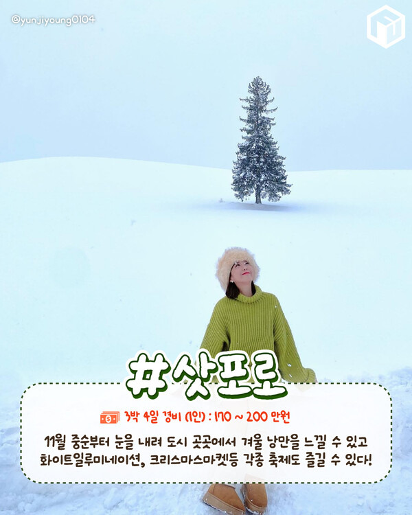 특히 삿포로 화이트 일루미네이션는 물론 크리스마스 마켓등 각 종 축제들을 즐길 수 있어 11월 최고의 해외여행지입니다.