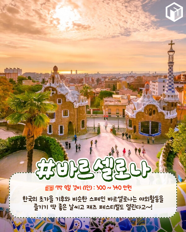 11월의 바르셀로나는 평균 기온은 15도 정도로, 우리나라의 초가을과 비슷한 기후로 여행을 즐기기 좋은 날씨입니다. 바르셀로나는 도시 곳곳 발 딛는 곳 마다 천재 건축가 가우디의 눈을 사로잡는 건축물들을 만나볼 수 있습니다.
