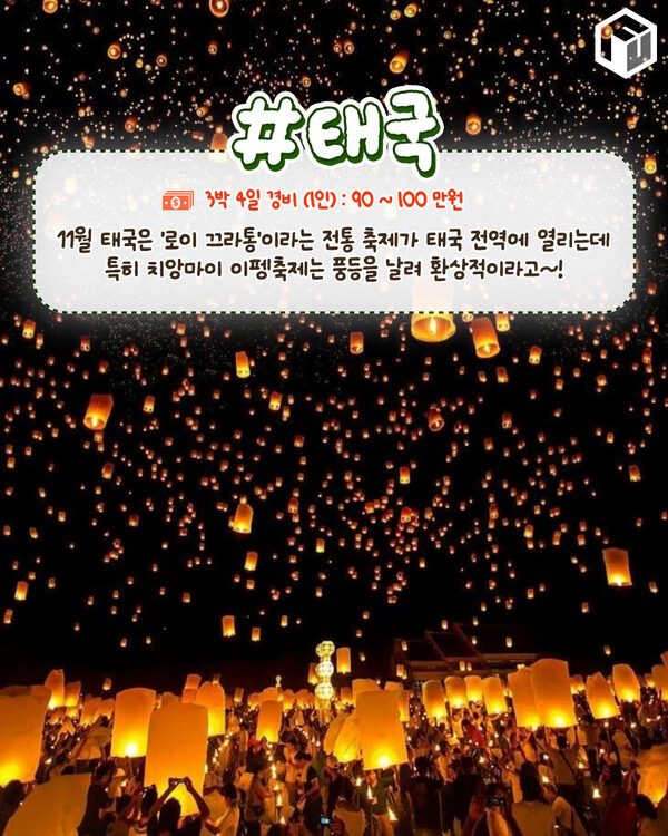 가을이 쏜살같이 지나 찬바람이 부는 가을과 겨울의 사이인 11월은 한 해가 끝나 싱숭생숭한 기분도 겹쳐 센치해지는 계절입니다. 이런 계절, 날씨일 수 록 특별한 추억과 경험을 즐기러 해외여행을 떠나기 딱 좋은 때입니다.