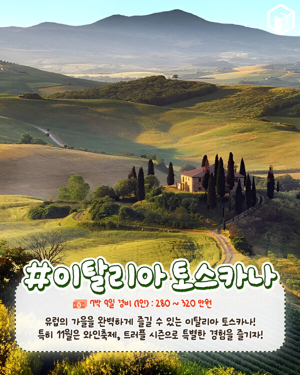 11월 이탈리아 토스카나 지역은 유럽의 가을을 완벽하게 즐길 수 있는 여행지로 다른 유럽 지역들보다 온화한 기후 덕분에 가을을 만끽하기 좋은 여행지입니다.