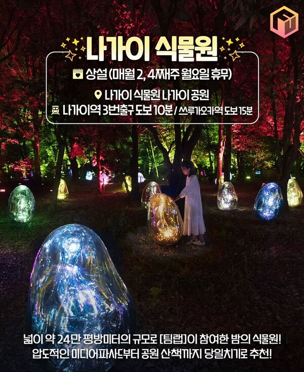 미디어파사드로 유명한 팀랩이 오사카 나가이 식물원에서 진행중인 '밤의 식물원' 입니다. 나가이 식물원 '밤의 식물원' 일루미네이션은 상설 전시인데요. 약 24만 평방 미터의 대형 식물원의 자연과 인터랙티브 작품이 자연스럽게 어우러져 마치 영화 아바타 속 장면처럼 몽환적인 풍경이 펼쳐집니다.