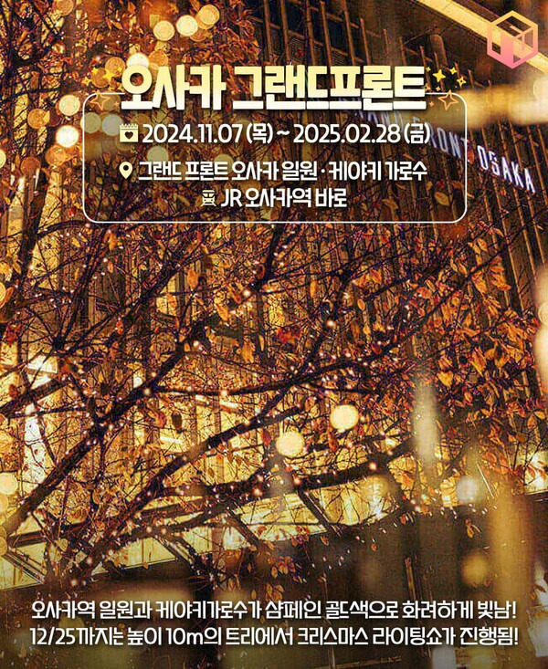 오사카역 바로 앞, 우메키타 광장 주변과 케야키 가로수길은 샴페인 골드 빛으로 반짝일 예정입니다. 그랜드프론트 오사카 일루미네이션은 11월 7일부터 2025년 2월 28일까지 진행되는데요. 일루미네이션 축제장 일원이 약 25만구의 LED로 황홀한 야경을 선사합니다.