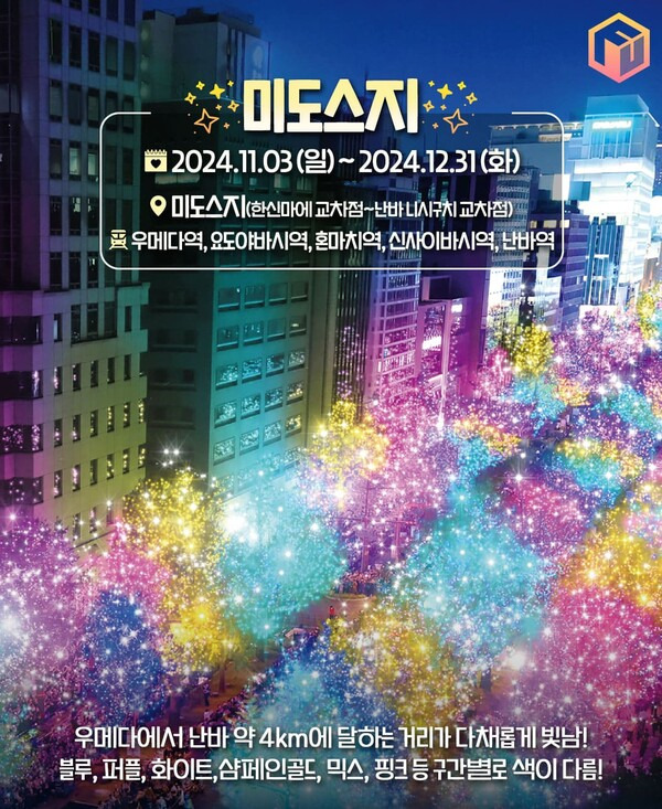오사를 대표하는 일루미네이션, 미도스지 일루미네이션 2025는 2024년 11월 3일부터 12월 31일까지 약 두 달간 진행됩니다. 우메다 한신마에 교차점에서 난바 니시구지교차점까지 약 4km에 달하는 거리가 다채로운 빛으로 반짝여 황홀한 야경을 선사하는데요. 2024~2025 미도스지 일루미네이션은 구간에 따라 빛의 색이 다릅니다.