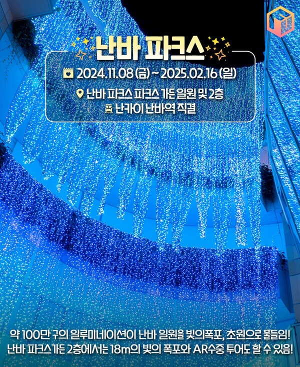 난바역과 이어진 난바 파크스 가든에서는 2024년 11월 8일 금요일부터 2025년 2월 16일까지 화려한 일루미네이션이 시작됩니다. 약 100만구의 전구가 난바 파크스 곳곳에서 반짝여 초원과 폭포 등을 표현해내는데요. 2층 그레이시아 코트에서는 길이 18m에 달하는 푸른빛의 '빛 폭포'를 감상할 수 있습니다.