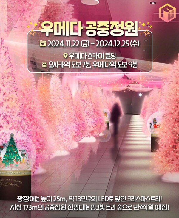 오사카 우메다 스카이빌딩은 지상 173m 공중정원에서 오사카 시내 야경을 감상할 수 있어 인기있는 관광지 중 하나입니다. 우메다 스카이빌딩 앞 광장에는 2024년 12월 25일까지 크리스마스트리가 설치되는데요. 높이 25m, 약 13만구의 LED가 국내 최대급의 매핑 영상으로 트리를 감쌉니다. 11월과 12월 다른 내용의 일루미네이션 공연이 펼쳐지니 참고하시면 되곘습니다.
