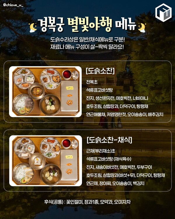 2025 경복궁 별빛야행 도석수라상 메뉴는 작년과 동일합니다. 기본 구성은 동일하지만 채식 메뉴를 선택하시면 요리에 사용되는 재료가 채식으로 변경됩니다.
