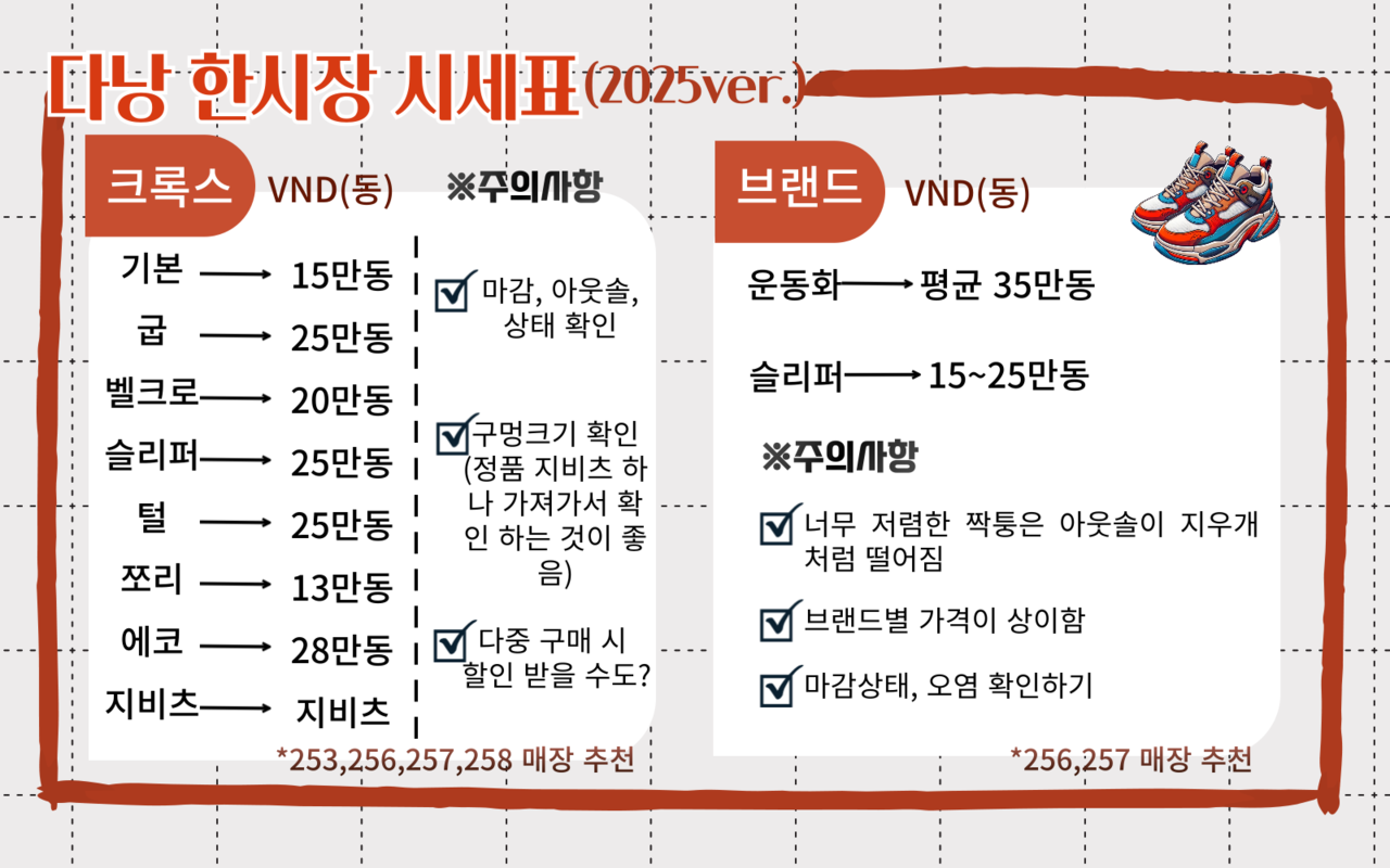 브랜드 로고가 붙어 있는 운동화를 구매하실 땐 더 꼼꼼하게 따지는 것을 권장합니다. 시장 내 브랜드 운동화는 비슷한 외형에 로고만 따로 붙여 넣는 경우가 부지기수이기 때문이죠. 물놀이에 이용 가능한 슬리퍼는 크록스보다 살짝 비싸므로 흥정을 많이 시도해 보세요.