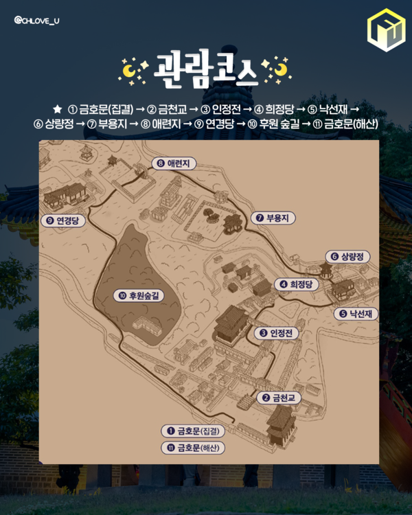 올해는 돈화문 공사로 인해 창덕궁 금호문에서 출발해 금호문 → 진선문 → 인정전 → 희정당 → 낙선재 → 상량정 → 부용지→ 애련정과 애련지 → 연경당 → 후원 숲길 → 금호문 관람할 수 있다.