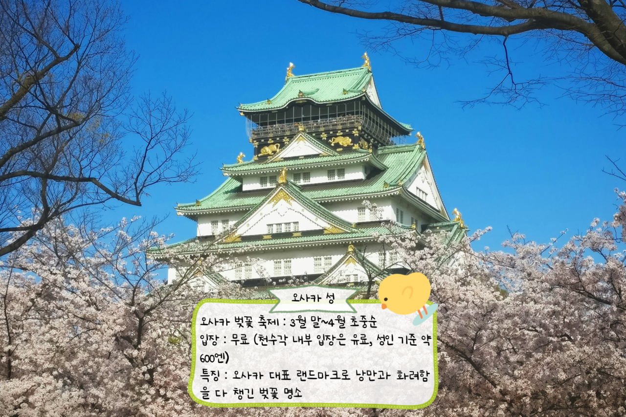 오사카의 대표 랜드마크인 오사카 성 공원은 매년 봄이면 약 3,000그루의 벚꽃이 성을 감싸며 장관을 이룹니다. 웅장한 성벽과 분홍빛 벚꽃이 어우러진 풍경은 오사카에서만 만날 수 있는 특별한 봄의 모습이죠.