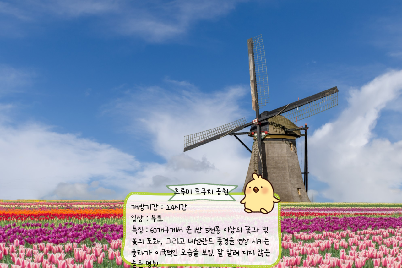 또한, 풍차와 네덜란드 풍경을 연상시키는 정원, 열대식물원, 일본식 정원 등은 츠루미료쿠치 공원을 더욱 이국적인 장소로 변하게 만들죠. 잘 알려지지 않은 숨은 오사카 벚꽃 명소이기 때문에 저장 후 몰래 다녀와보세요!