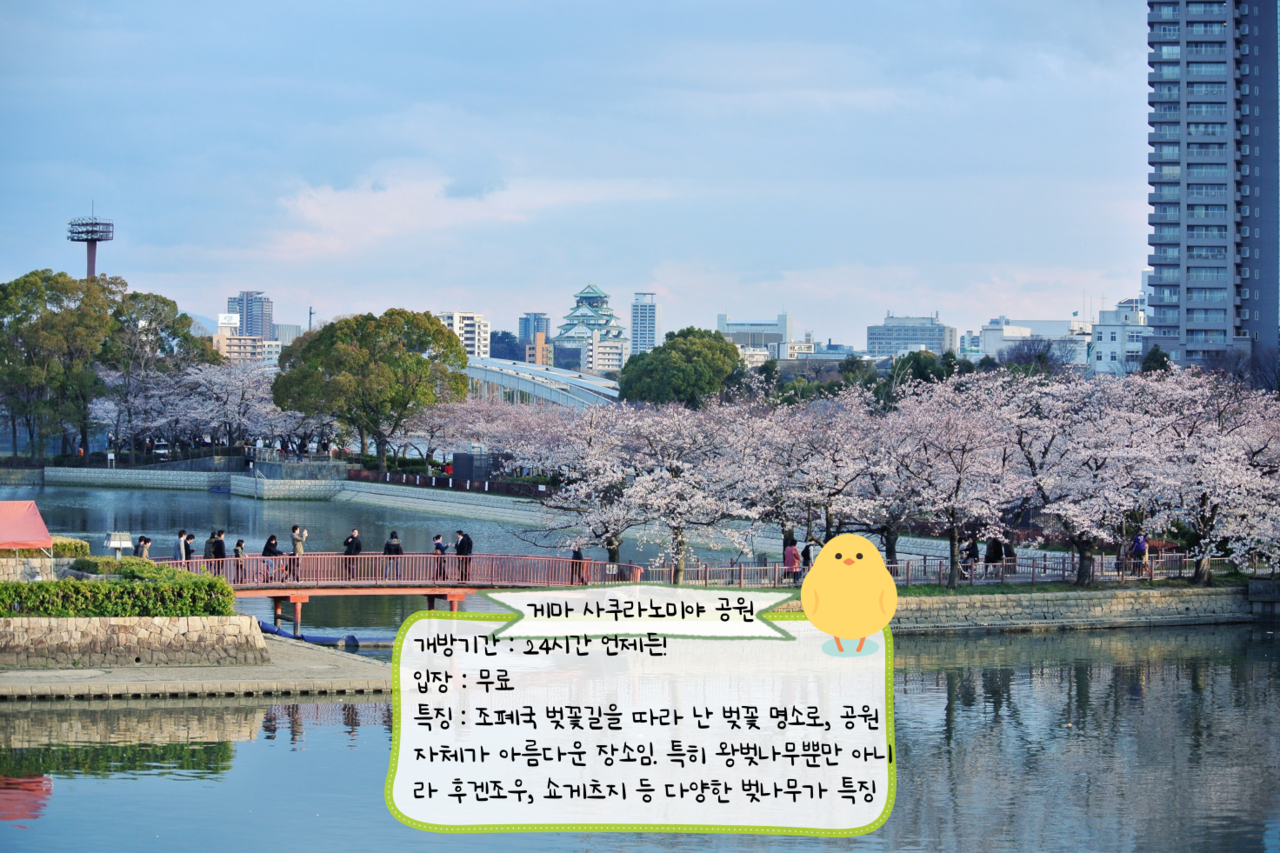 게마 사쿠라노미야 공원은 대표적인 오사카 벚꽃 명소로, 오가와 강변을 따라 약 4.2km에 걸쳐 벚나무가 빽빽이 늘어서 있는 장소입니다. 이곳은 봄철에 많은 관광객들이 찾는 인기 있는 벚꽃 구경 명소로, 약 4,800그루의 벚나무를 볼 수 있는데요.